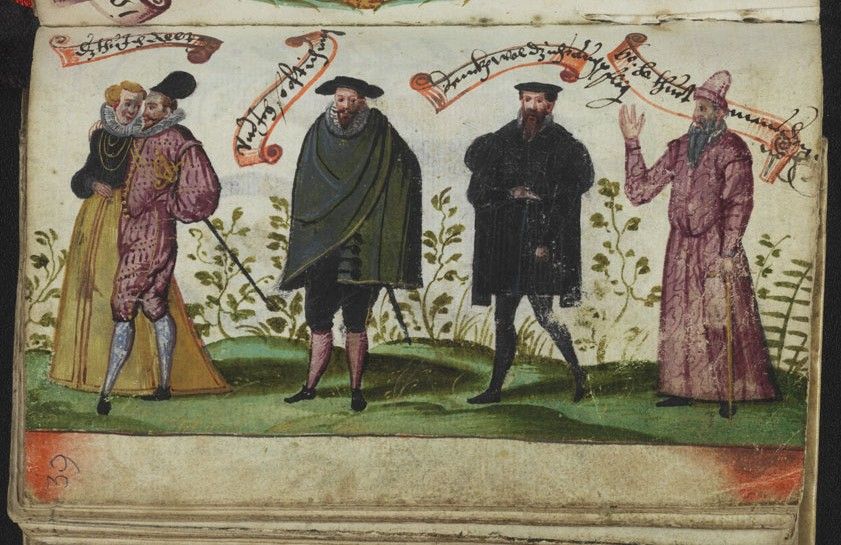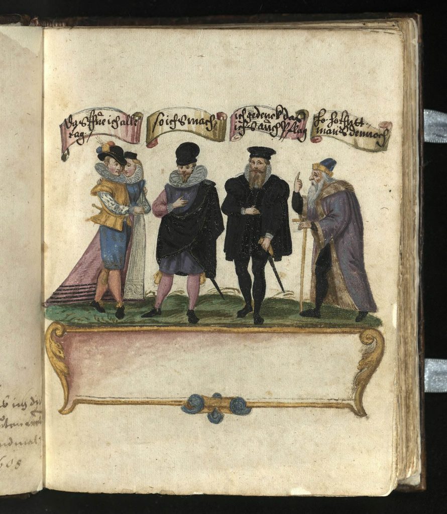 There is apparently another example of our motif in the album of Carl d.J. Elsenheimer (dated entries 1616-31), but I have not been able to confirm this, and the Keils refer to another which they dated to the 1590s in their Die Deutschen Stammbucher Des Sechzehnten Bis Neunzehnten Jahrhunderts (1893), in an album kept by an unnamed student of Altdorf university, but interpret the oldest man as a Jew with a long beard.