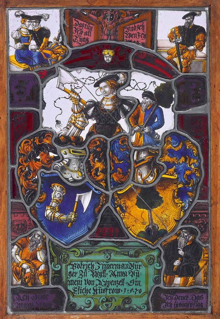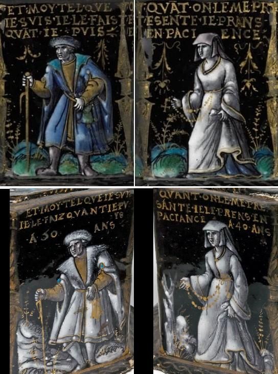 But — like any motif worth its salt — it was also taken up by the glass-painters, and is found on a Swiss panel dated 1570 recently sold at auction, each of the ages occupying a corner of the pane with their usual inscriptions.