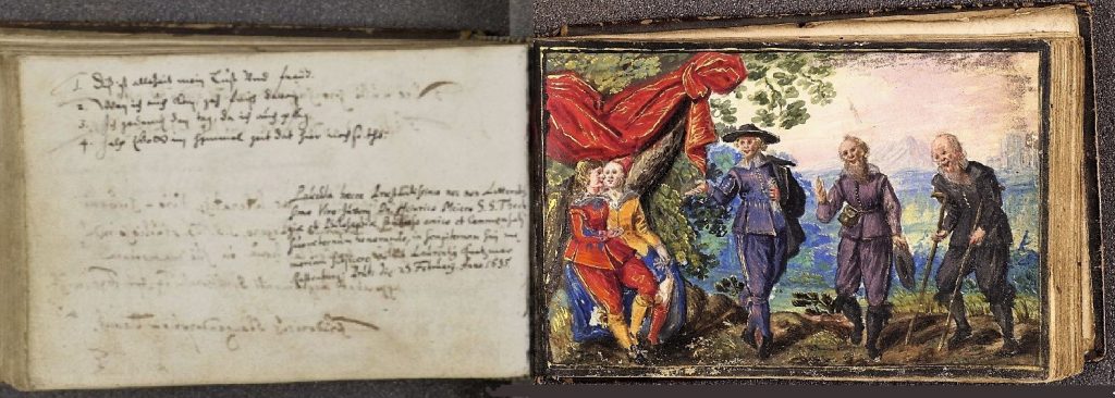 Jakob von der Heyden, the publisher of the Pugillus Facetiarum (Strasbourg 1608, 1618) states in his preface that many of the designs in this print-book were taken from actual students’ albums he had seen and, inasmuch as examples are found in albums before 1608 (see the Melchior Pfinzing von Henfenfeld album miniature below), this does indeed seem to be true.