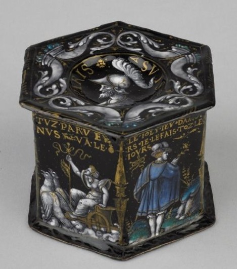 While the above print in Munich is the earliest example of the motif known to me, the next earliest is not a graphic image at all, but an enamel-painted salt made by Colin Nouailher in Limoges in 1542