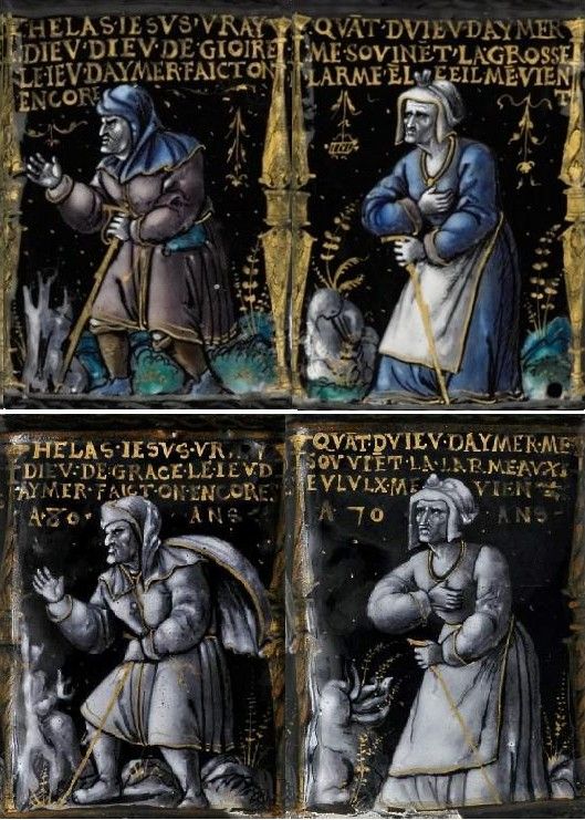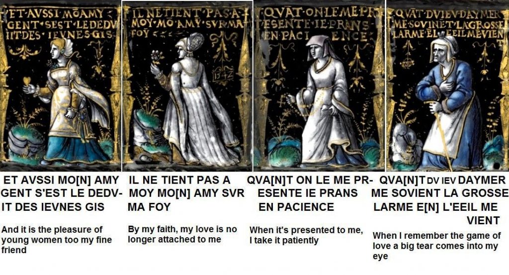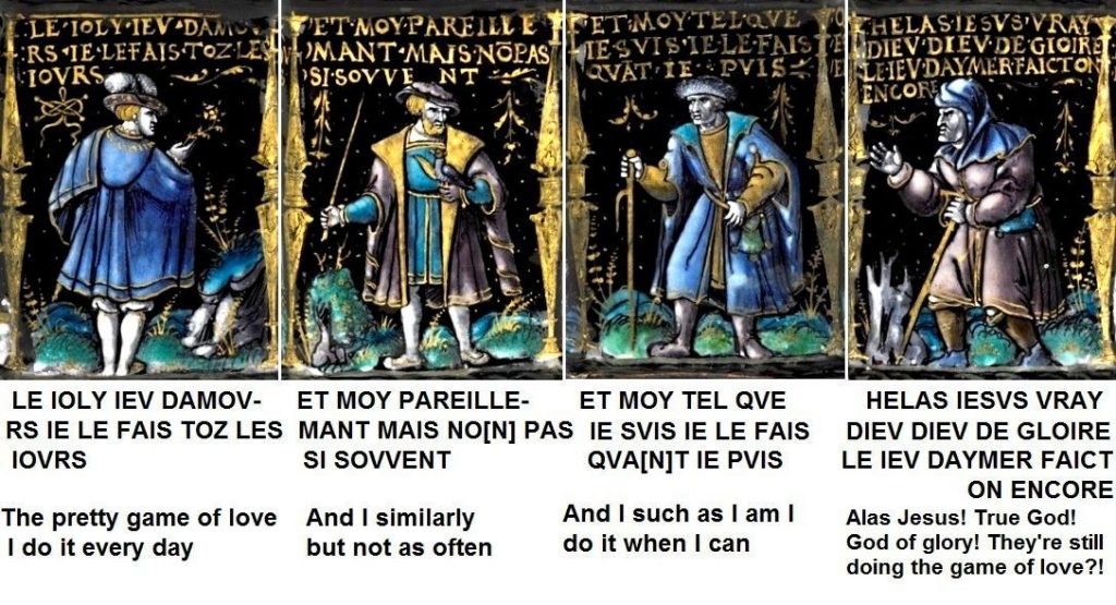 Here (above) we see the young man boasting: LE IOLY IEV DAMOVRS IE LEFAIS TOZ LE IOVRS [the pleasant game of love, I do it every day]. The excellent photographs of the salt on the Wallace Collection site enabled me to put together this composite of the four men and their speeches: