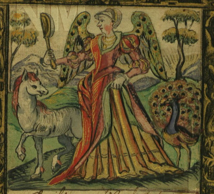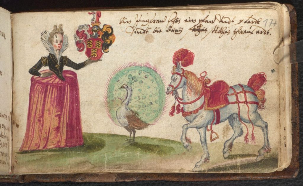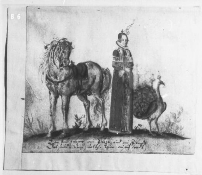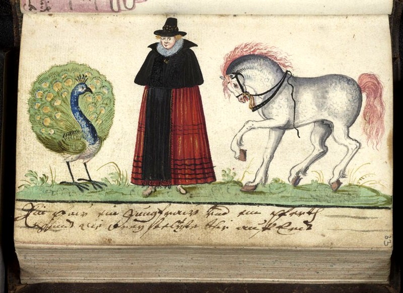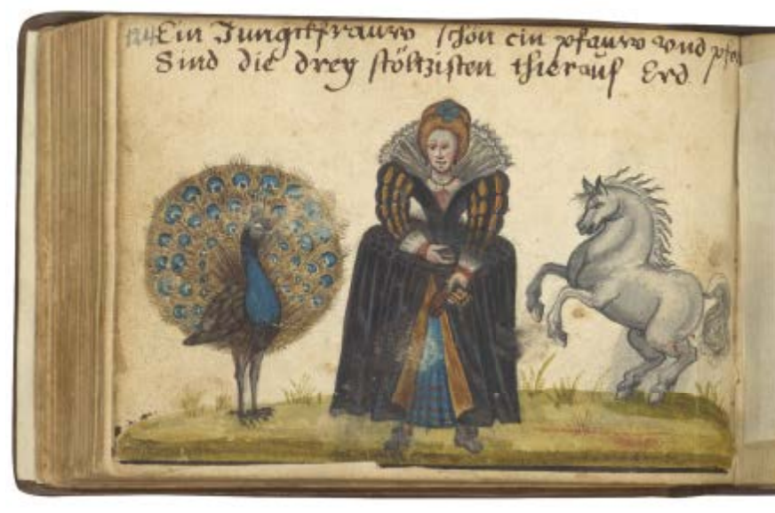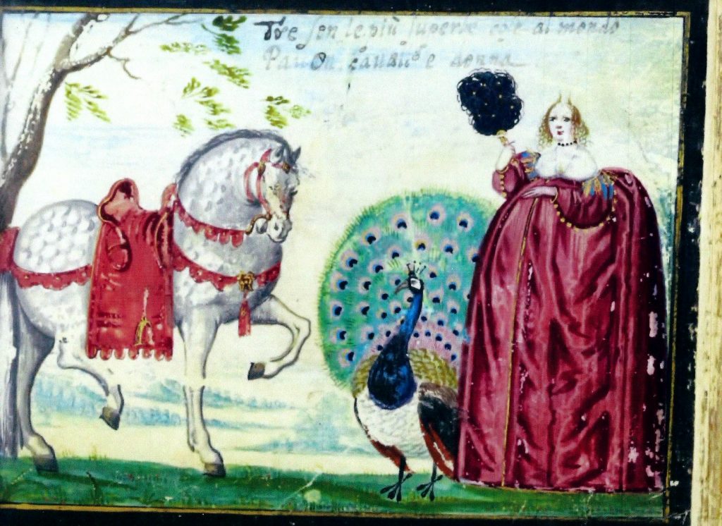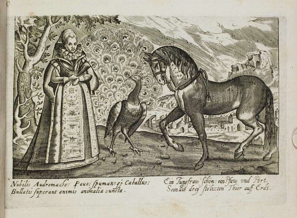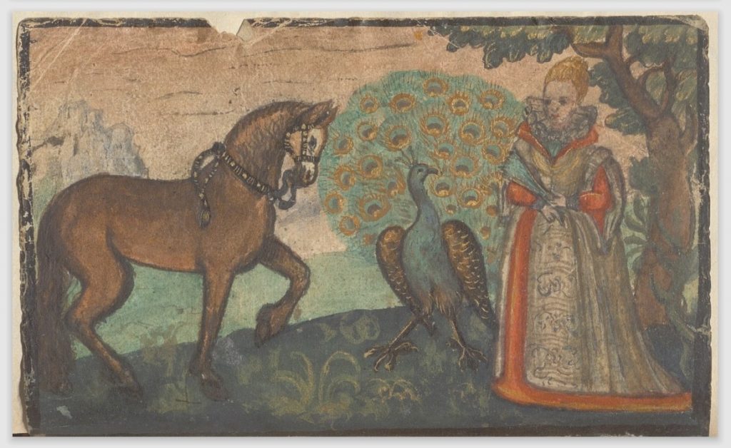 So… The Three Proudest are: the Peacock (ok — we’re used to that one of old), the Horse, and the Woman (esp. young and beautiful, presumably). In addition to the images shown below, an orphaned leaf of this motif (peacock placed centrally) dated 1639 was sold as lot 168 in the du Rosey sale — Weigel, Leipzig, 1864. Probably the same leaf subsequently sold by Kende in Vienna in February 1927, as lot 474.