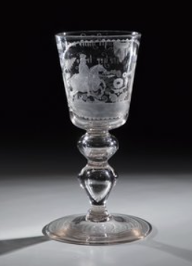 The motif is found on Baroque glassware too; a Silesian engraved glass goblet of c.1690 was engraved with the traditional scene and a shortened version of the familiar dialogue: Halt still du Schönes Jungfräulein / Stich her trieff recht das Rüngelein. On another 18C Bohemian glass goblet engraved with our motif