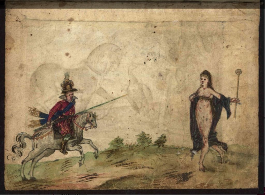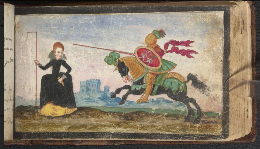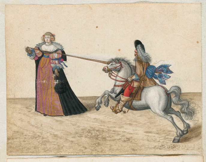 As we have seen already, the albums abound in images of thinly-veiled erotic metaphors — here is another. To date I have noticed 5 such miniatures in the albums, only one of which certainly predates the appearance of the Philotheca Corneliana print-book in 1619 — and here the horseman’s target is a circular garland rather than an outsize finger-ring.