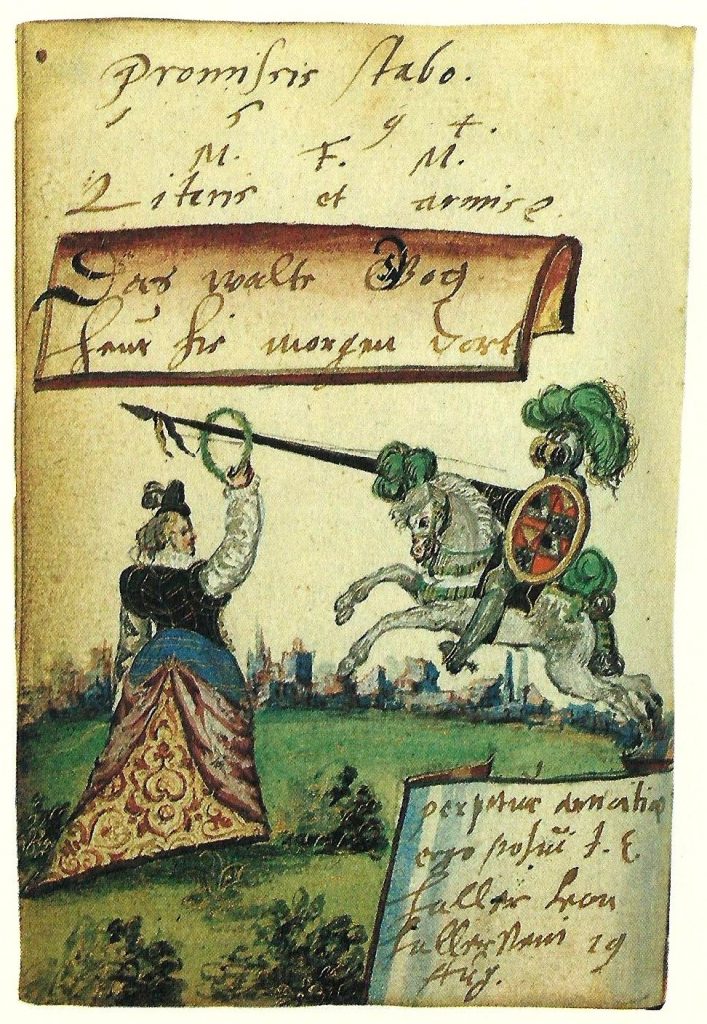 the auction-house transcribed the accompanying inscription as Schöner engel häste meiner Lanzen sticht der her treffe wie ich hästen will — followed, understandably, by (?)