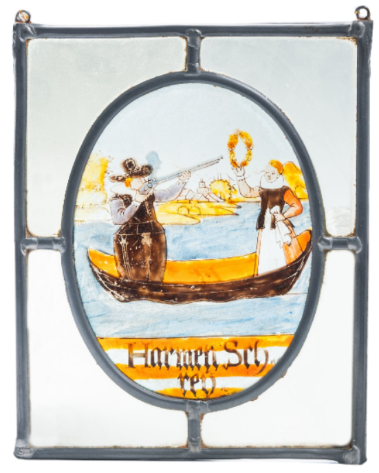 The motif was too good to be limited to manuscript paintings only! Here — with the technology updated — are a later 17C Dutch couple in a huwelijksbootje [little wedding-boat], the groom, Harmen Schrey, firing his rifle through the bride’s garland.