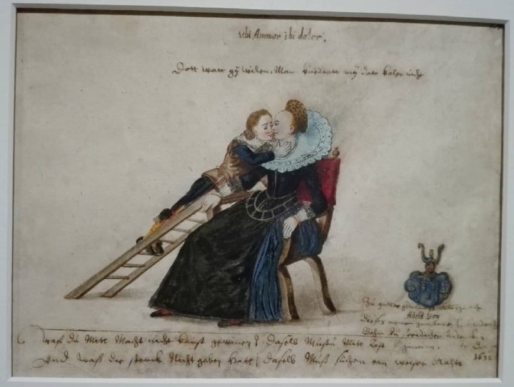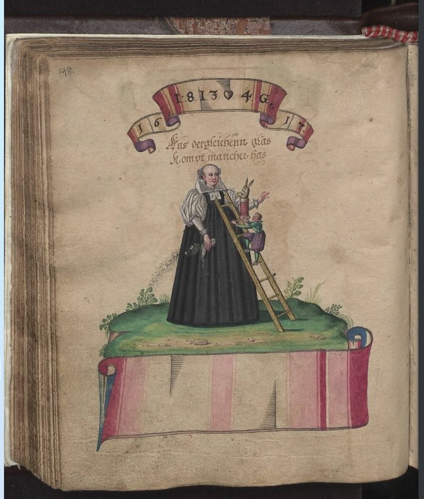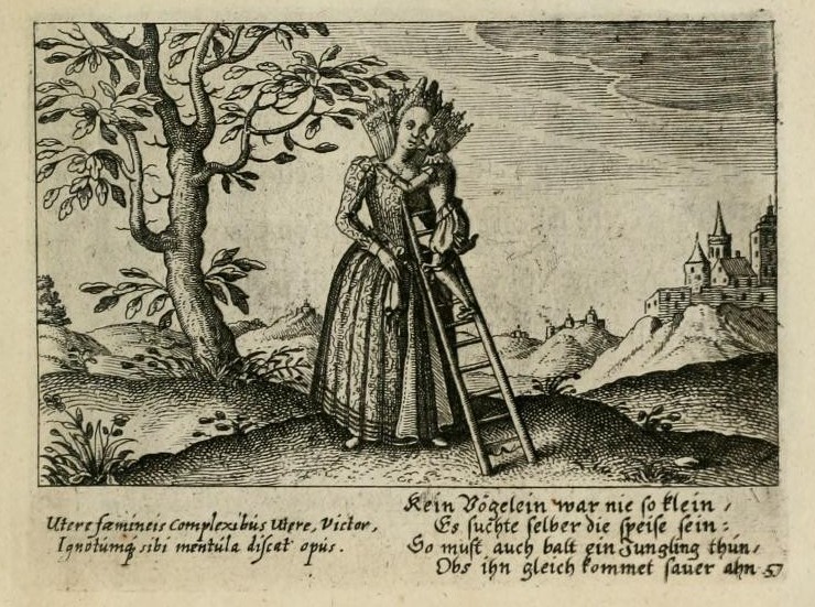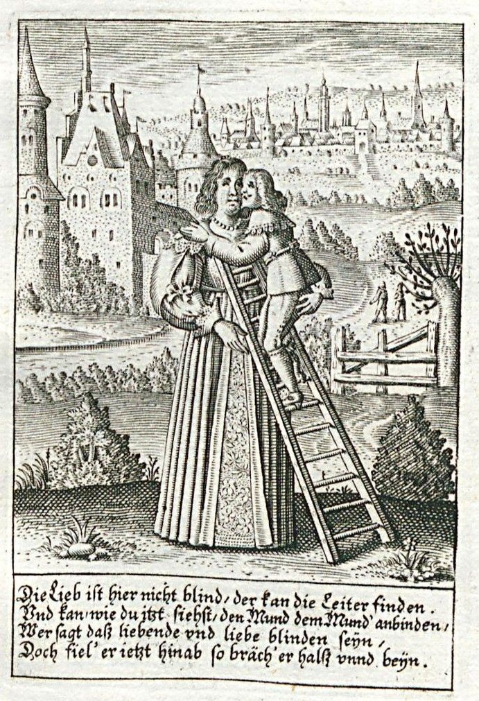 dated 1598. Stuttgart, WLB, Fromann Collection, cod. hist. fol. 888-31, f.96v.tiny man climbs ladder to woman carrying a hare in a glass, legend: Aus dergleichenn glas/ kompt mancher has; from the album of Jakob Petzke, dated 1617. Wroclaw, University Library, Department of Manuscripts, Akc. 1969/145, p.198.Stuttgart, WLB, Frommann Collection, cod. hist. fol. 888-3, f.162v. [n.d.]miniature signed in 1633 by the young painter, Adolf Boy (1612-78). Apparently (via Facebook!) in the Muzeum Narodowe w Gdanskufrom the print-book “Vita Corneliana” ([Berlin] 1624) engraved by Peter Rollos [here as reprinted c.1680 in “Le Centre de l’Amour]. The Latin is a quotation from the opening of Martial’s 78th Epigram in Book 11 addressed to a bridegroom named Victor: “Use female embraces, use them, Victor/ and let your penis learn the work unfamiliar to it”from the “Allemodisch Stambuch” published by Peter Rollos in Berlin in the 1630s; etchings signed by WGF [not known to me]design for shooting target, 1609. Coburger Scheibenbuch, f.49r. Kramer & Kruse ( Coburg 1989), p.82, note that the standing figure is Count Johann Casimir von Sachsen-Coburg’s dwarf, Jacob Eckel, and that the perimeter inscription is a variant of the proverb found in Rollenhagen’s Froschmeuseler (1595) but were evidently unaware of the album precedents for this motif? 19C. from Max Bauer, Sittengeschichte des deutschen Studententums (Dresden 1926)