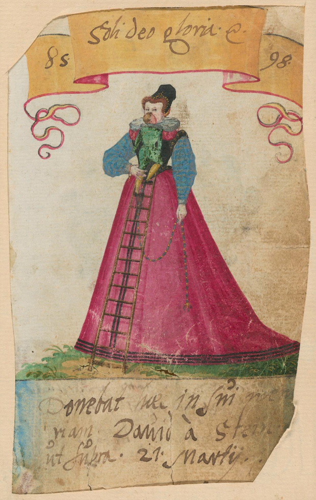 or is it a perfectly ordinary-sized man and a giantess? Another popular album amicorum motif which seems, indeed, to have originated in the albums — the earliest I’ve found is dated 1598 [BELOW] –which was then picked up by the print-books (“Vita Corneliana”, 1624 BELOW) — and has endured