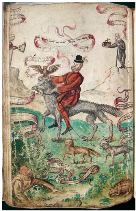 A young man rides a wolf, has an owl hawk-like on his right hand and has two cats on leashes. A monk (?) watches him (bottom left), while in the distance on opposite montainous crags, an old woman holds out a lantern, and an old man facing her, holds out a mouse-trap. The various banderoles are almost illegible but Christoph Gasser has kindly managed to make out the words spoken by the wolf-rider: Ich reidt mit in die Ja[c]ht na[ch] m[e]usen die ganze nahct [I ride along on the hunt for mice all night long] This fits with the presence of the mouse-trap in the old man’s hand and with the owl and cats, both of which prey on mice — or is this a heavily disguised sexual reference. with which we might compare Lady Capulet’s remark alluding to her husband’s past amorous adventures: Ay, you have been a mousehunt in your time [Romeo & Juliet, act IV, scene iv] ?