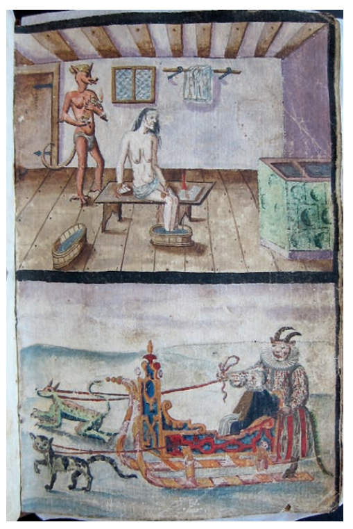 The Van Damm album includes several sinister scenes involving demons of various sorts — on one page, a horned devil wearing a ruff drives a sleigh drawn by a cat and dog (?), and in a separate scene set in a bath-house, a devilish long-tailed bath-attendant looms behind an old woman who sits bathing her feet in a tub of presumably warm water heated by the Kachelofen in front of her. On another page, this mysterious scene: