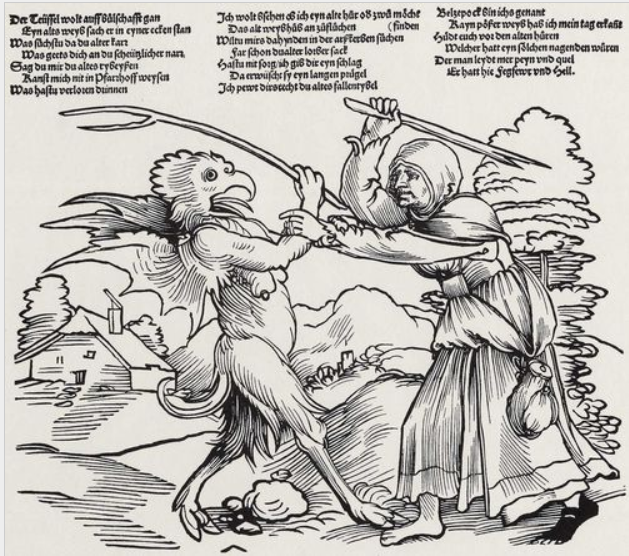 The locus classicus — print-wise — is the frequently reproduced Hopfer engraving in which a gang of old women/witches have overpowered the Devil and are currently beating him up while he cries for mercy (next), which I supplement with a contemporary engraving by Binck in which the weapon is that quintessentially female implement, the distaff: