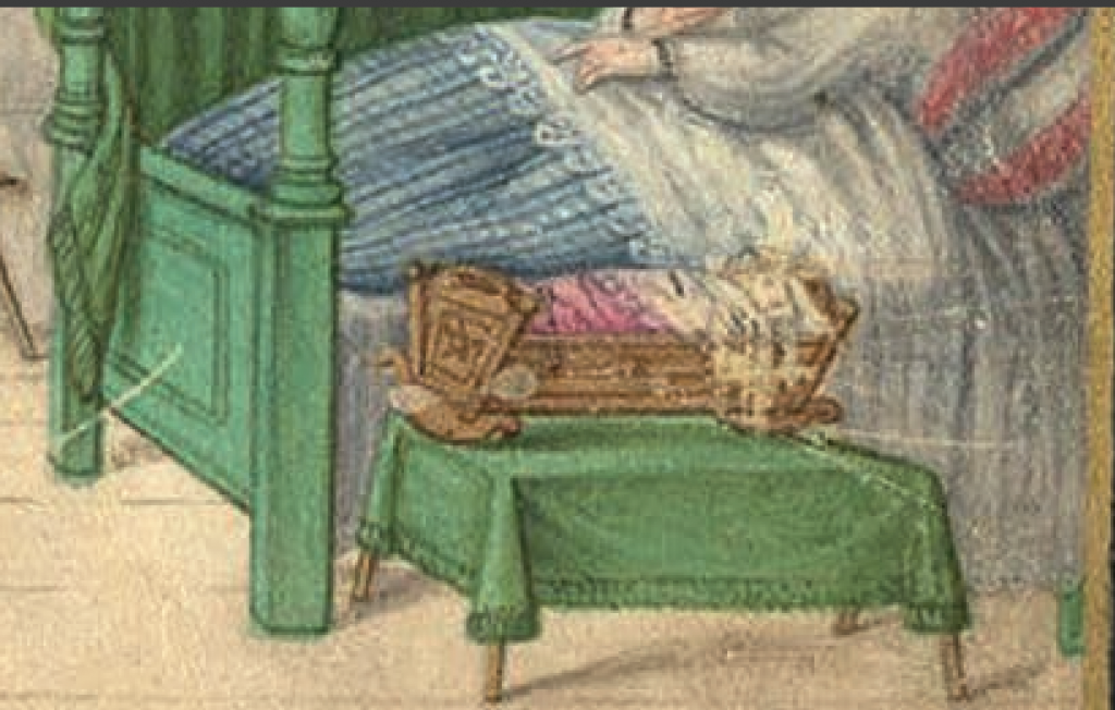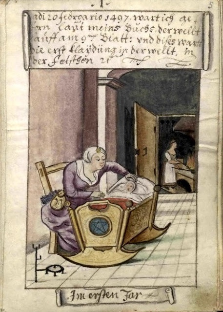 Here’s a small collection of cradles protected with the device, beginning with a page from the wonderful 16C Trachtenbuch of Matthäus Schwarz, depicting baby Matthäus in his cradle at one year old in 1497
