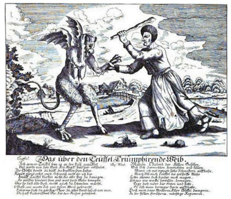 The type certainly continues via the mid 17C print entitled Das über den Teufel Triumphirende Weib