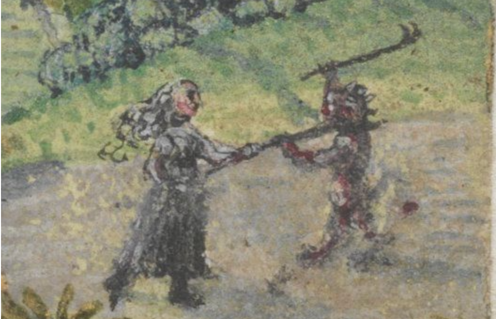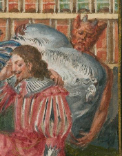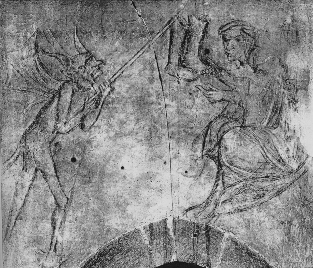 This is the only manuscript example I’m aware of, but there are many examples in Swedish church wall-painting — Odenius counted no fewer than 18 examples of the motif executed between the 1450s and 1520s, suggesting the exemplum must have had some sort of didactic function – perhaps as a pictorial warning to the congregation against the sin of calumny. In the church murals the favoured site is either side of the chancel arch, visually emphasising the distance the Devil is anxious to keep keep from the Old Woman!