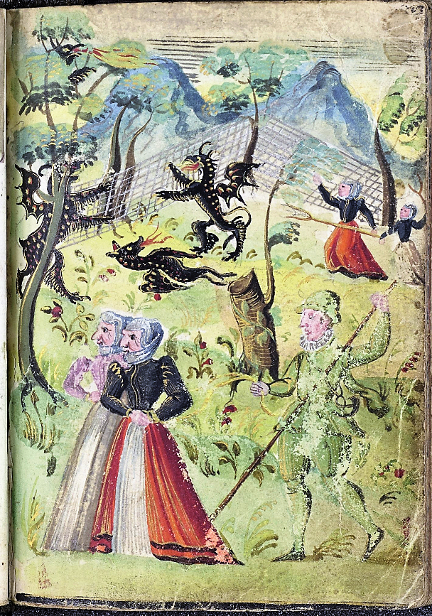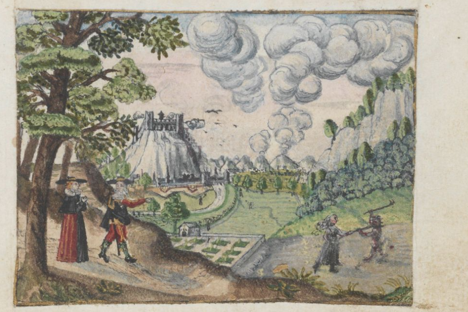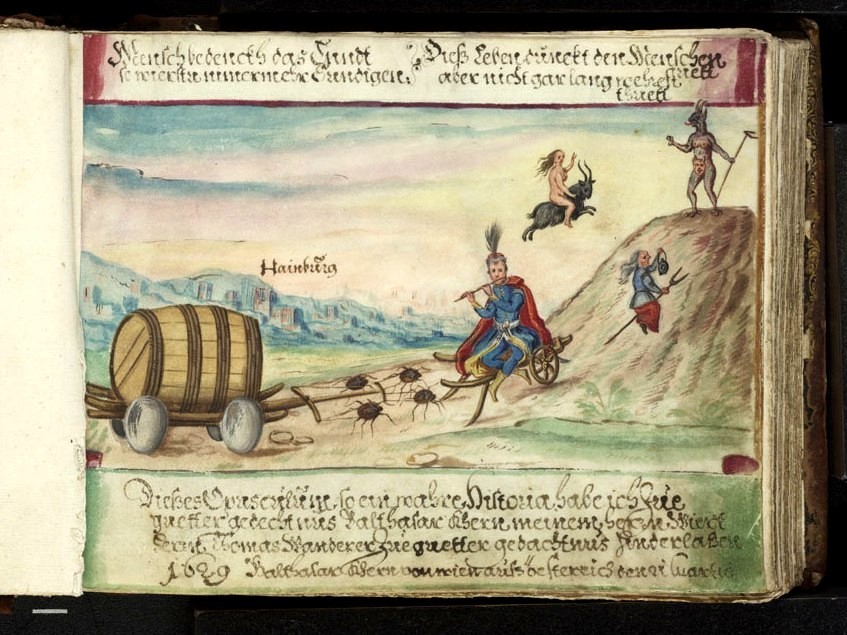 I was prompted to write this post by ‘discovering’ the page reproduced below in the album of Thomas Wanderer, painted in 1629 — which I think must be unknown, even to German scholars! Two witches, one naked riding a goat, the other clothed riding a pitch-fork, fly to the summit of a hill (the Braunsberg, according to the trial-testimony excerpted below) near the town of Hainburg-an-der-Donau (on the border between Austria and Slovakia) to rendezvous with a devil. This is clearly connected with the Hainburg witch-trials which took place in November 1617-to April 1618, and again in 1624.