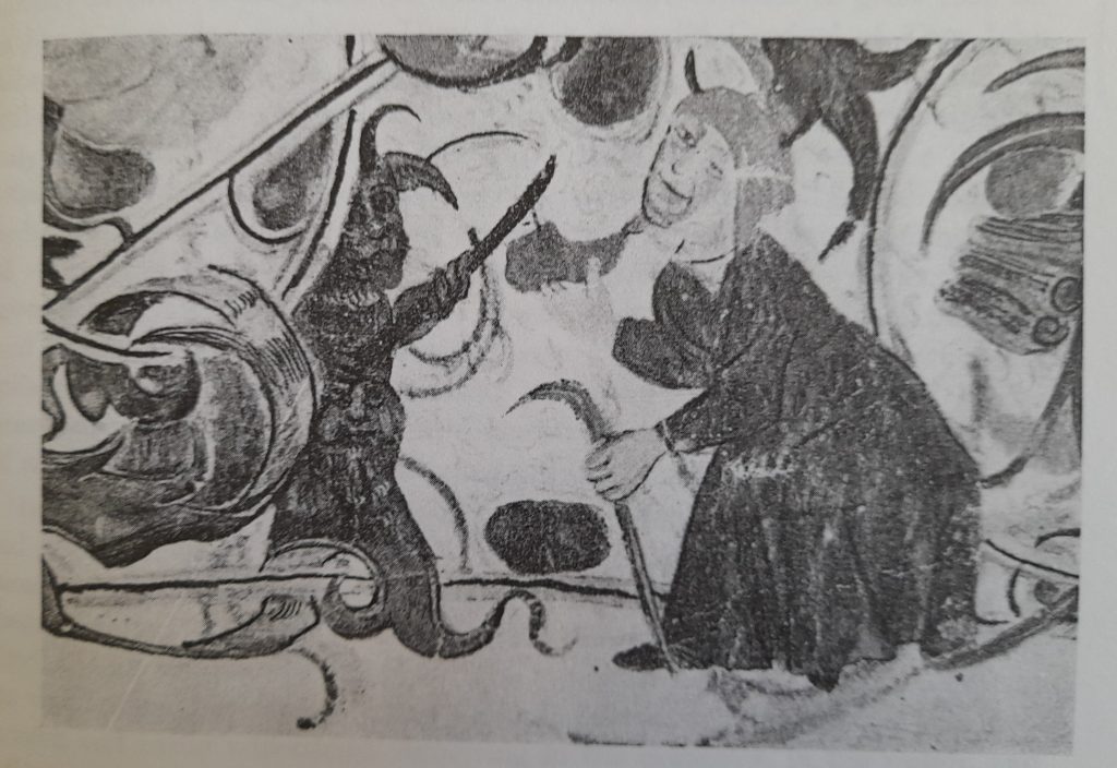 But there are examples in Czechia too. Jan Dienstbier recently identified one in the Castle at Zirovnice painted in the 1490s, but the earliest known example of the motif in any medium is in the church at Libis, painted in 1390: