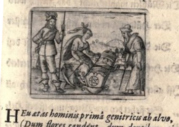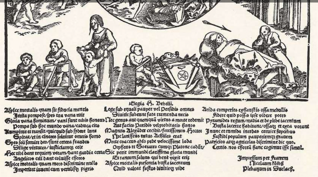 and here as one of the stages of human life on the print engraved by Hans Schaufelein in 1517 as a memorial to the recently deceased Heinrich Bebel