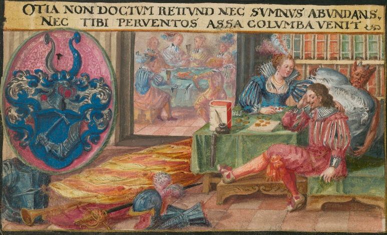 This proverb is found in various European vernaculars — my sub-heading is the usual English form. Here, the painter, who perhaps did not quite understand the Latin, has captioned the scene with a traditional couplet, but the 4th word should be REDDVNT and PER VENTOS is 2 words! It means “Laziness and too much sleep do not make one learned / nor will the winds bring a roast dove to you” — unless you live in Schlaraffenland /Cocagne, of course, where sleeping is paid by the hour, and ready-roasted birds fly into your mouth! The couplet, unillustrated, is found much earlier written into the album of Johann Jakob von Staal in 1567.