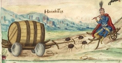 “She admits, approximately 9 years ago, she extracted four buckets full of wine in a magical way in Hainburg out of a wine cellar not far from the market-place . This wine she drove up to the Hainberg (mountain) on a horse-drawn cart, which was made according to the following specification: four toads as horses, four eggs as wheels, two hayballs as wine boxes, on this she poured the four buckets of wine and brought it up [to the mountain], which wine she gave to the people but took no money for it.”