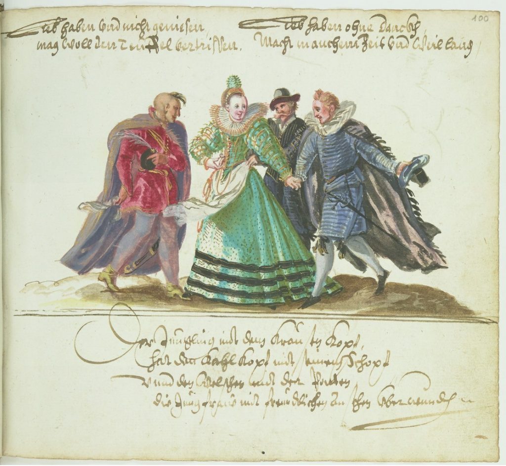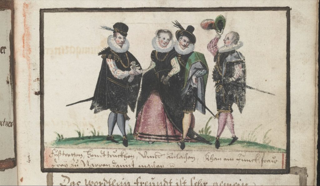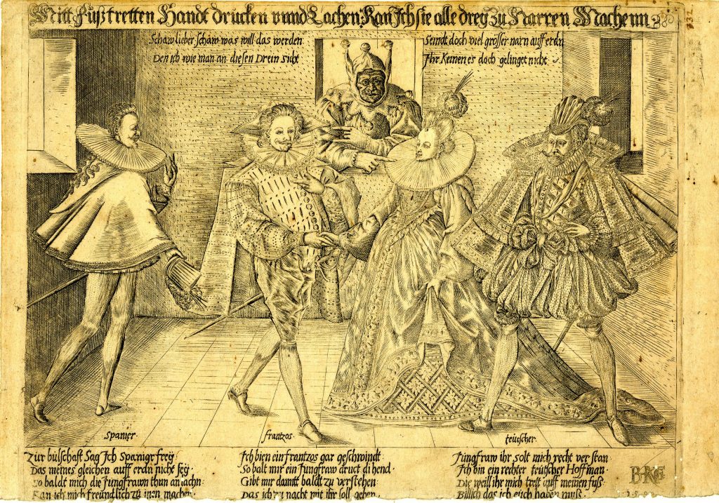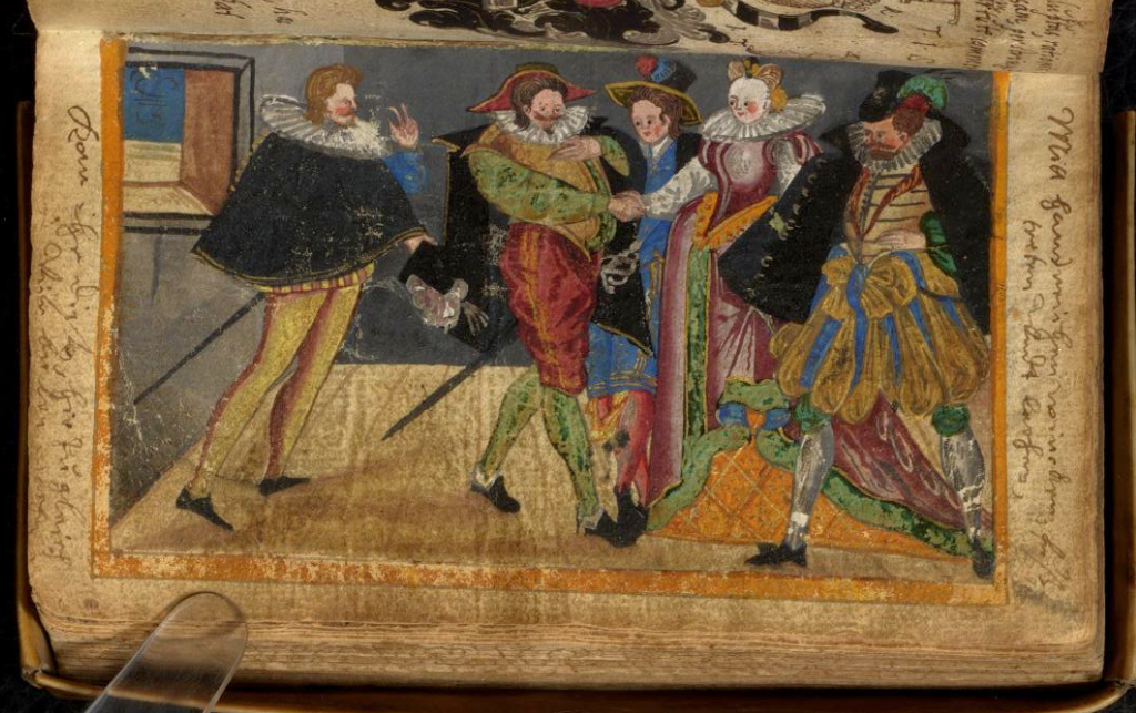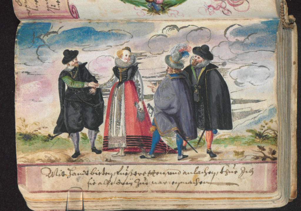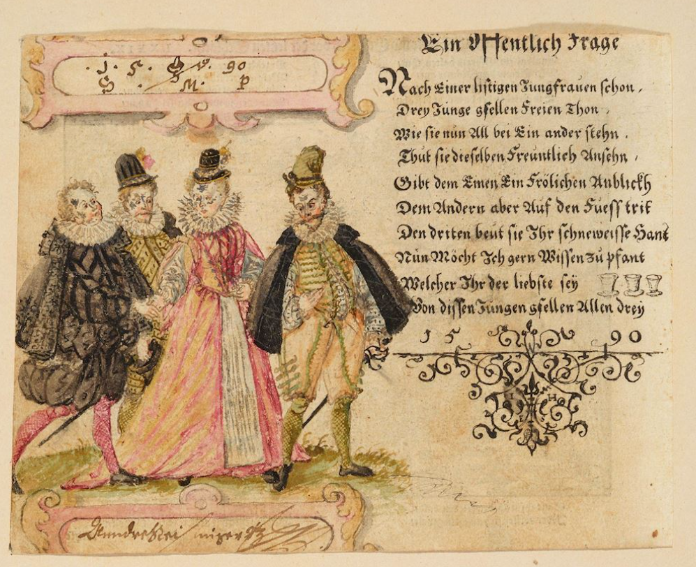 Before the Pugillus, the Monogrammist BKGF produced a print in 1590 in which, what I have elsewhere termed a ‘commentary’ fool, observes the lady and her 3 suitors and makes the ‘horns’ gesture …. [for other examples of this gesture not made by fools, see my post (30 Jan 2026) Gesture in the Albums]. We begin with this engraving and three album images that clearly derive from it. Extra spice is added to the Monogrammist BKGF’s print by the fact that the lady’s 3 suitors all hail from different countries. At the moment she is dancing?/holds hands with the Frenchman [frantzos], but the Spaniard [Spanier] is trying to engage her attention (left), while her countryman, the German [teutscher] behind her, looks decidedly miffed!
