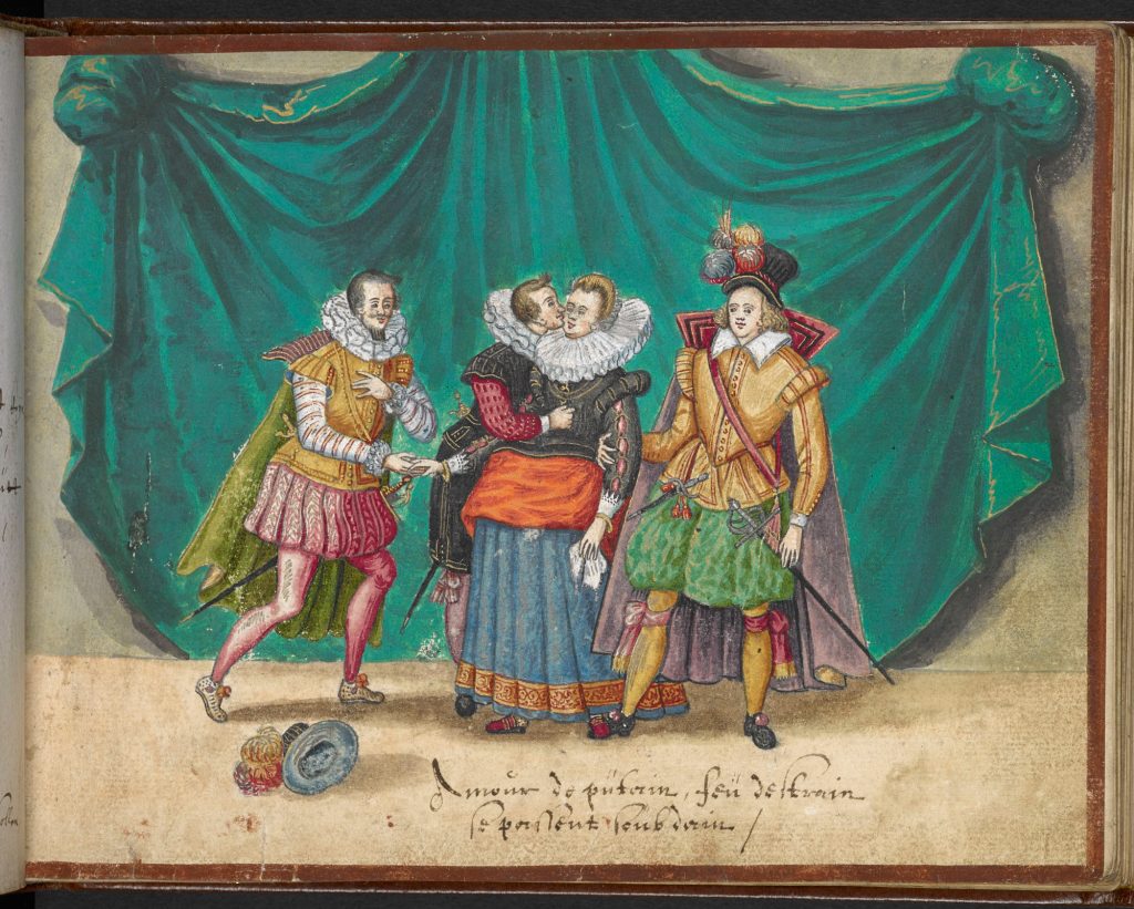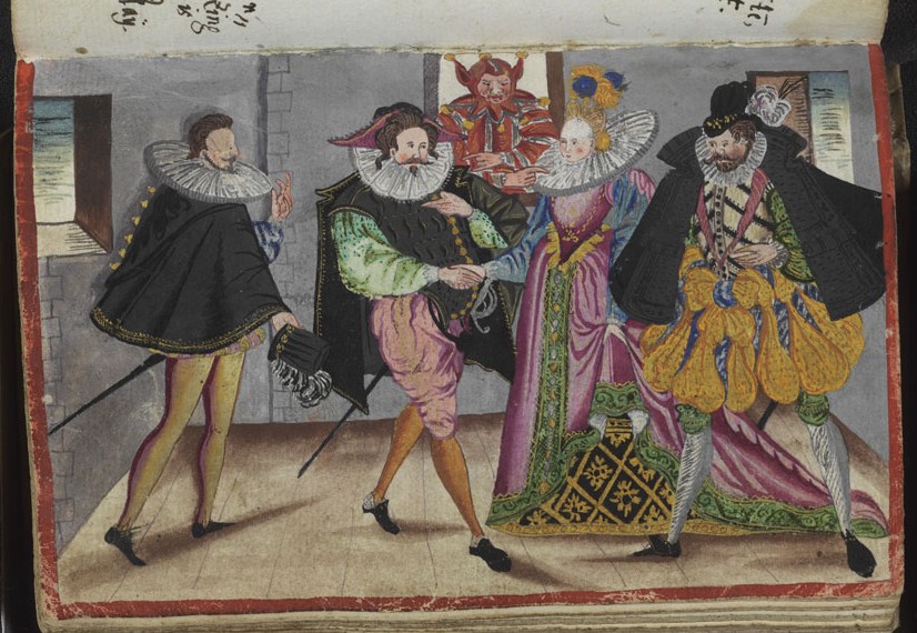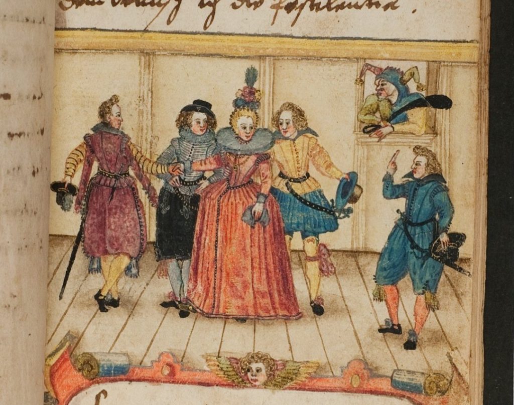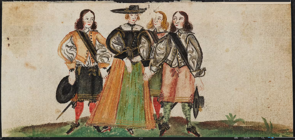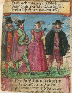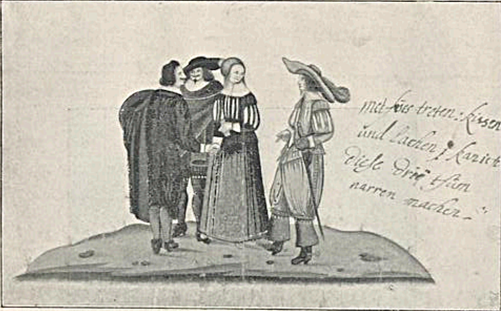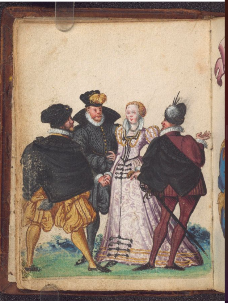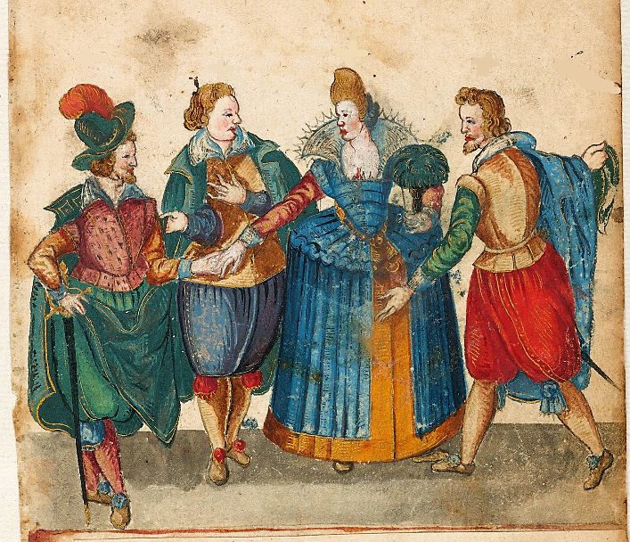 Before the Pugillus, the Monogrammist BKGF produced a print in 1590 in which, what I have elsewhere termed a ‘commentary’ fool, observes the lady and her 3 suitors and makes the ‘horns’ gesture …. [for other examples of this gesture not made by fools, see my post (30 Jan 2026) Gesture in the Albums]. We begin with this engraving and three album images that clearly derive from it. Extra spice is added to the Monogrammist BKGF’s print by the fact that the lady’s 3 suitors all hail from different countries. At the moment she is dancing?/holds hands with the Frenchman [frantzos], but the Spaniard [Spanier] is trying to engage her attention (left), while her countryman, the German [teutscher] behind her, looks decidedly miffed!