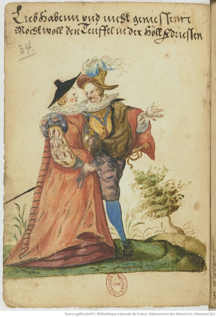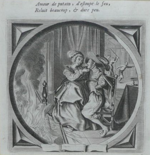 In the Walens album (below) the scene is captioned with a proverbial, if unflattering, verse: amour de putain, feu destrain se passent soubdain [a whore’s love is like fire in straw — both pass suddenly]
