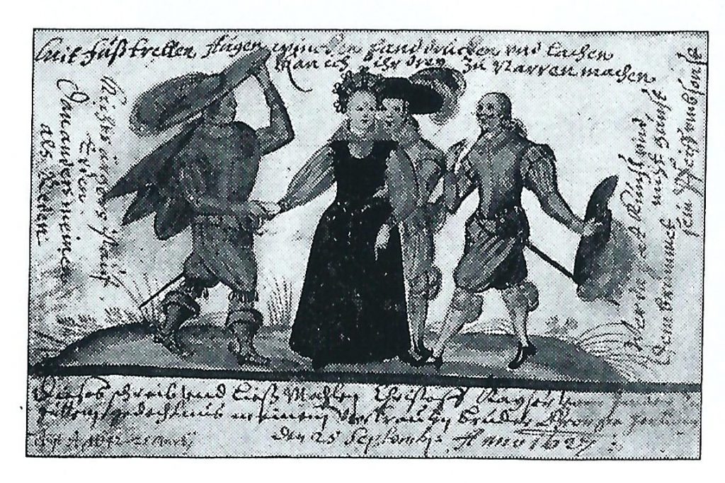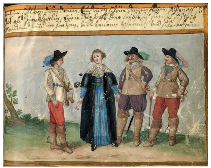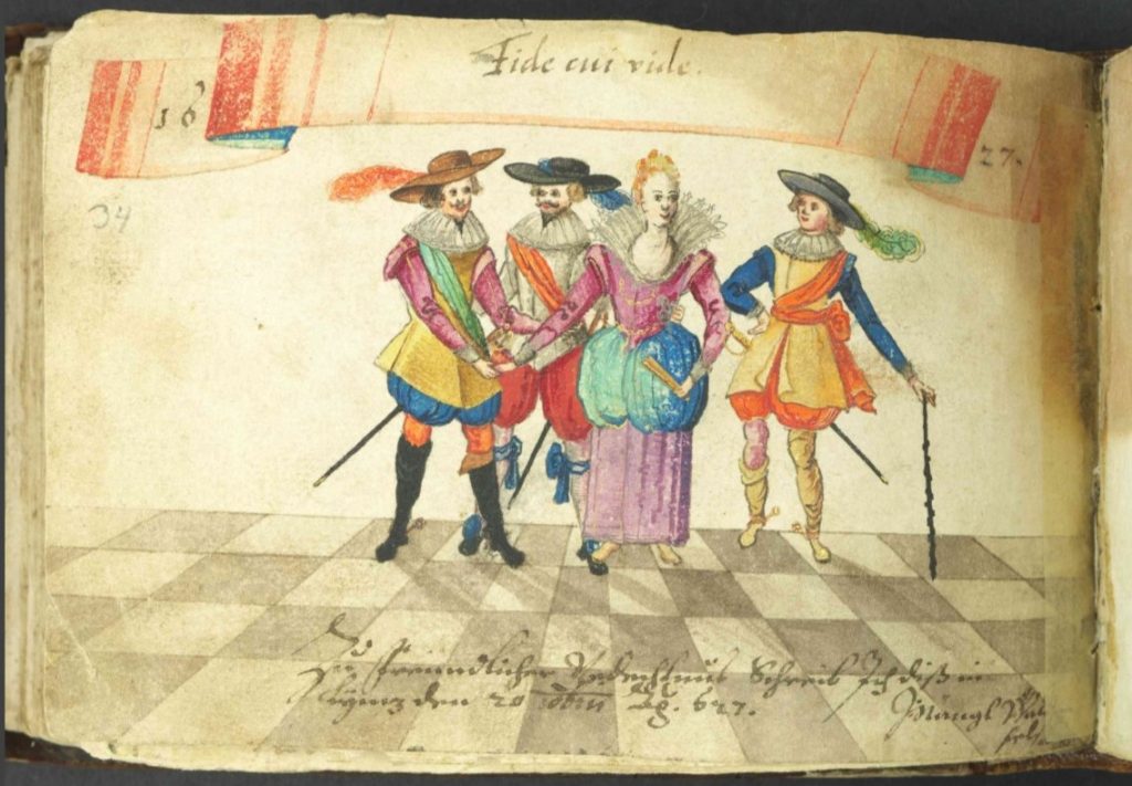 In the Jacob von Zinnenburg album the scene is captioned with a Latin proverb very common in the albums, Fide cui vide, which means ‘be careful who you trust’.