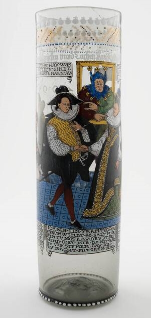 The same print was also the model for a contemporary enamel-painted Bohemian Humpen dated 1599 now in the Museum für Angewandte Kunst [MAK], Vienna.