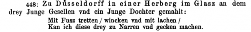 In the 1653 edition of Zingref’s Apophthegmata we hear of a glass pane (?) painted with our motif and accompanying verse in a Dusseldorf tavern: