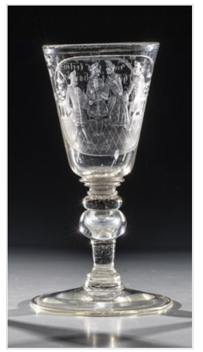 Above I mention three 17C glasses enamel-painted with the scene, but it is found engraved on glassware too, as in this early 18C Bohemian goblet sold at auction only last year; here the verse reads Mit fus treten hande geben kni beugen und lachen / kan ich alle drey Zu narren machen: