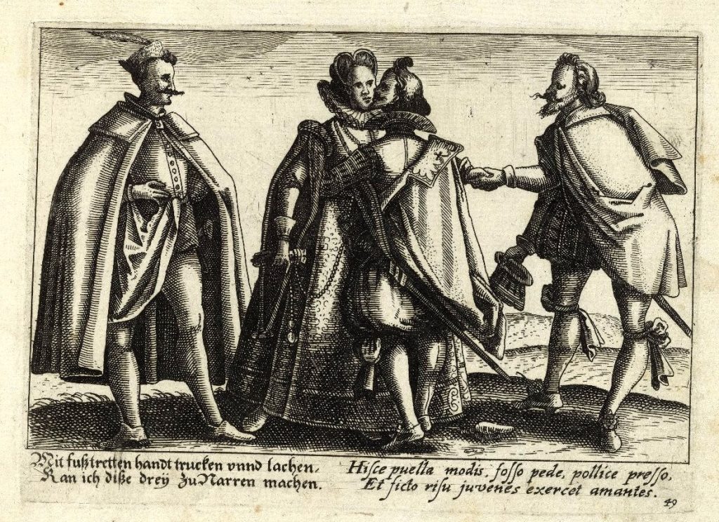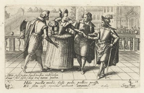 Playing footsie! This is an example of what, in one of my Pinterest boards, I call “significant gesture”. The lady is spoiled for choice — positively over-run with suitors. But who is her favourite? Is it the one whose foot she subtly treads on? But her mocking verse, frequently quoted, suggests that she is happy to string all three along! I give it here in the form used as the title of BKGF’s print of 1590 (see below):