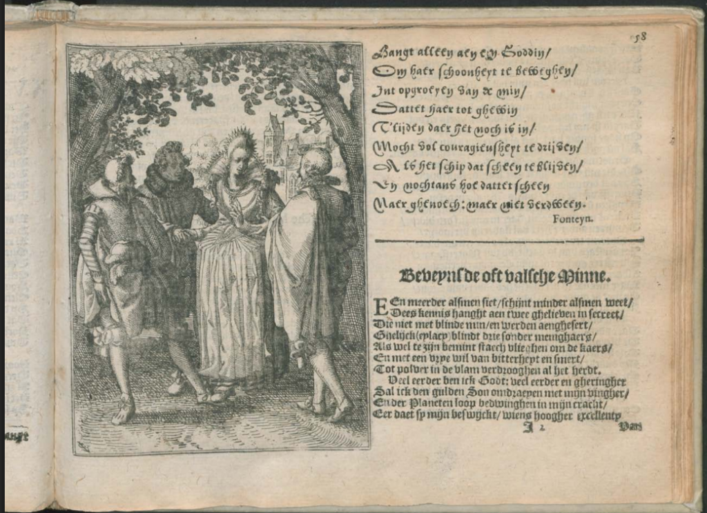 illustration to the poem Beveynsde oft valsche minne in Daniel Heinsius, Bloem-hof van de Nederlantsche Ieught, Amsterdam 1608, 1610, etchings by Claes Jansz. VIsscher II