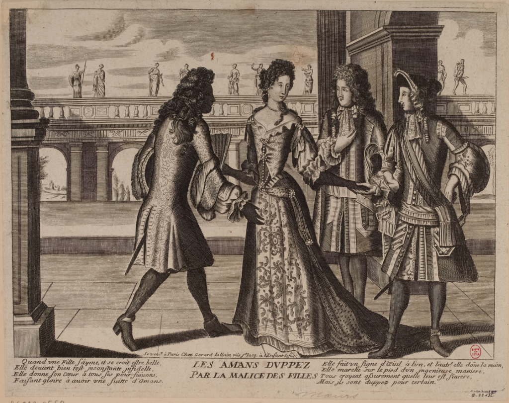 There is no doubting the tenor of this later 17C French print of our motif — the title is a bit of a giveaway! Les amans dvppez par la malice des filles [the lovers duped by the malice of girls]